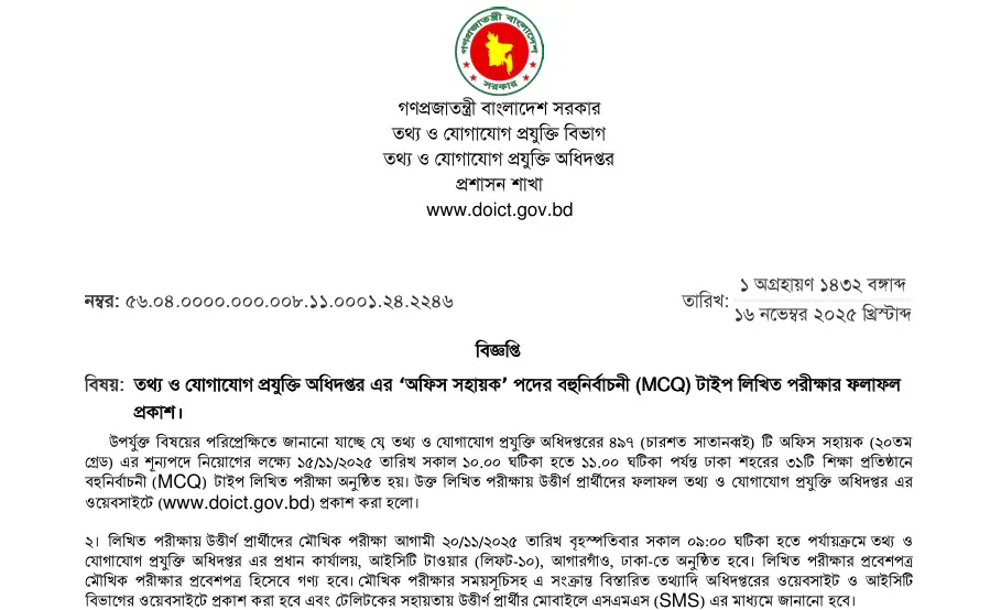 The exact ICT Office Support Staff/Office Sohayok Result Publish Date has not been mentioned officially by the DOICT yet. However, based on previous recruitment cycles and internal updates circulating among candidates, the result is expected to be published within 1–3 days of the exam. Since the MCQ exam took place on November 15, 2025, candidates may expect the result anytime after November 16, 2025.